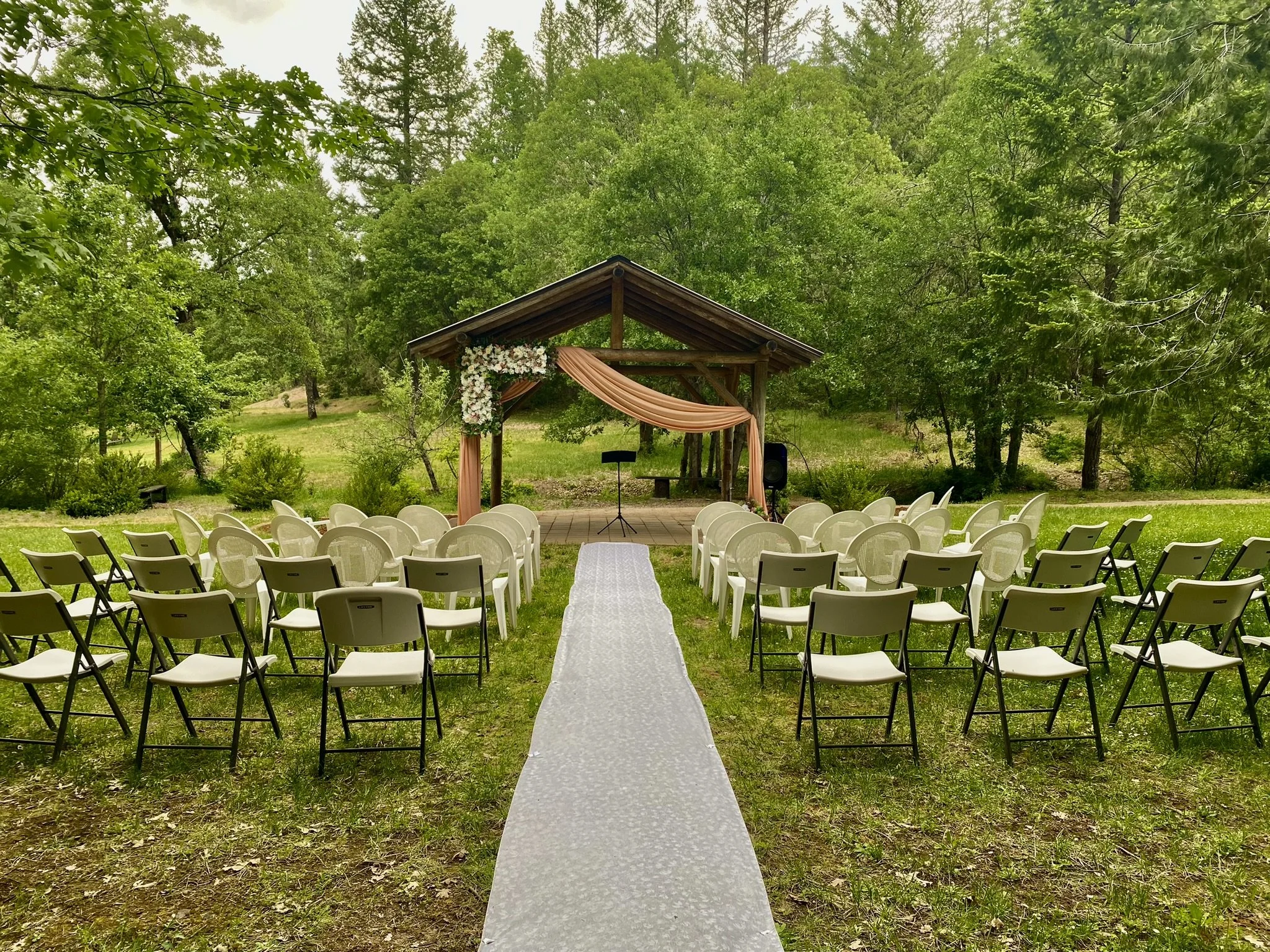Feel free to wander our land, following the pathways that guide you through grassy meadows and past a giant field adorned with solar panels. A seasonal creek meanders through the canyon, crossed by a foot bridge and a charming covered bridge leading to our wedding pavilion.