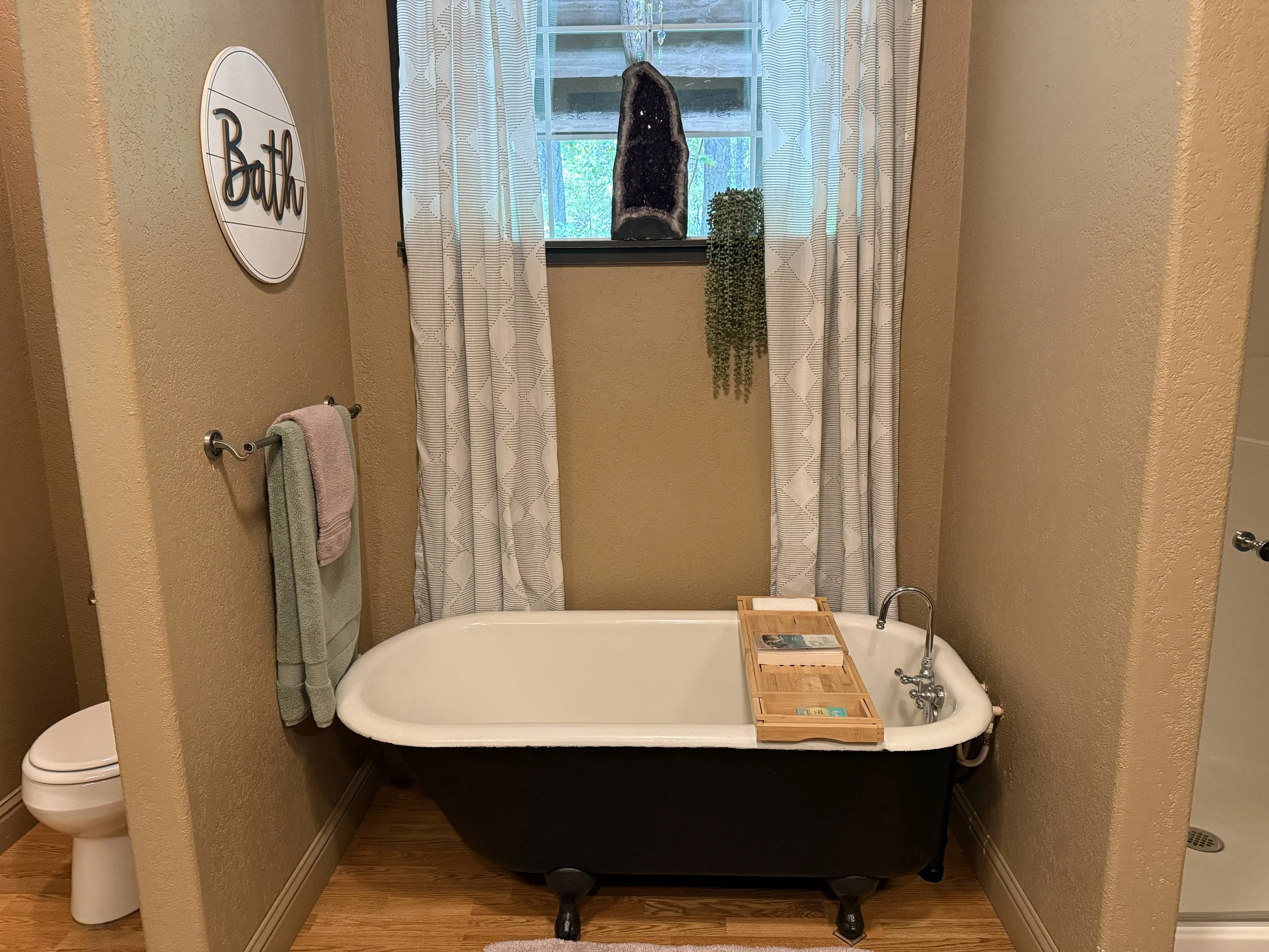 Imagine waking up to the sound of birds chirping as the sun rises outside. Spend your days soaking in the claw foot bathtub, wandering the land or use it as a home base for adventures in the area.