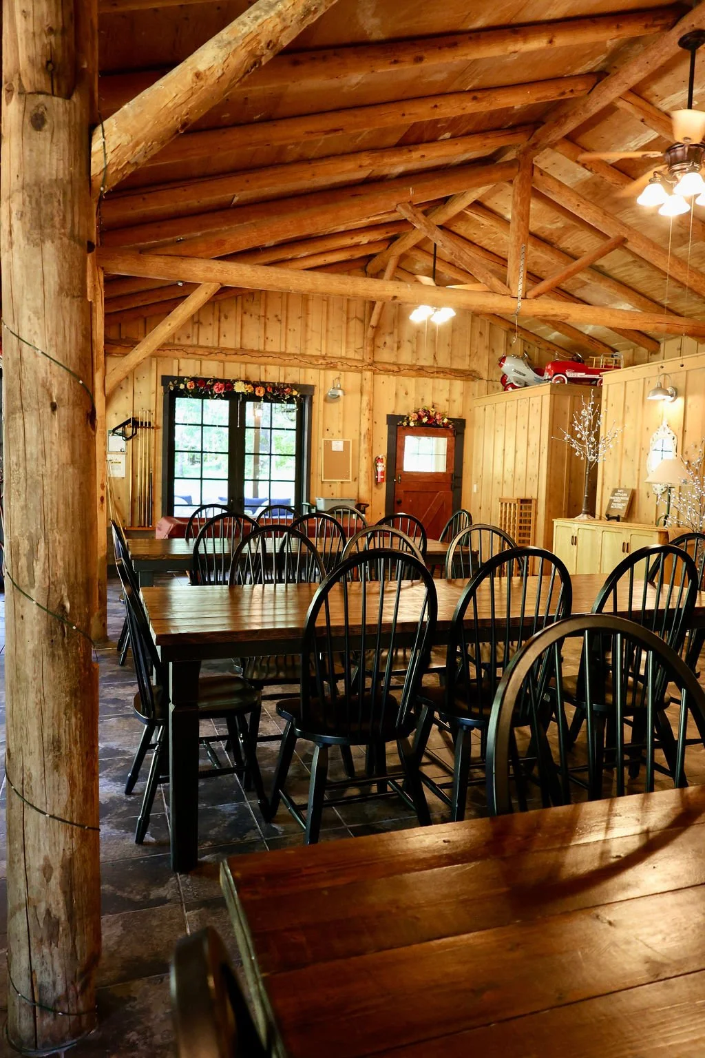 The café features two covered patio areas for relaxing and gathering. Out back, a spacious covered patio doubles as a dance floor, perfect for celebrations under the stars. Along the creekside, you’ll find another covered patio with three sets of Adirondack chairs, a perfect spot for morning coffee, quiet conversations, or taking in the sounds of nature.