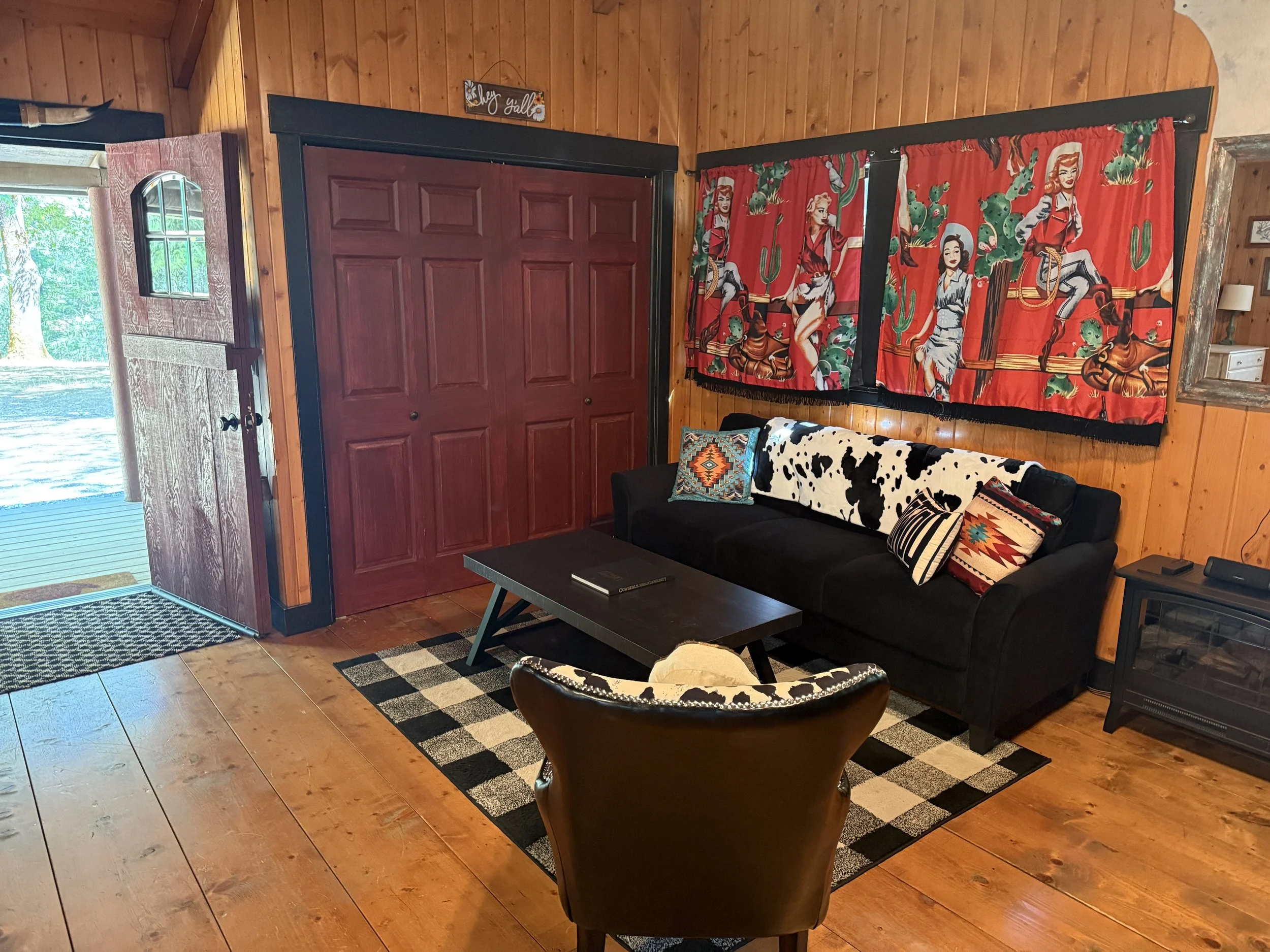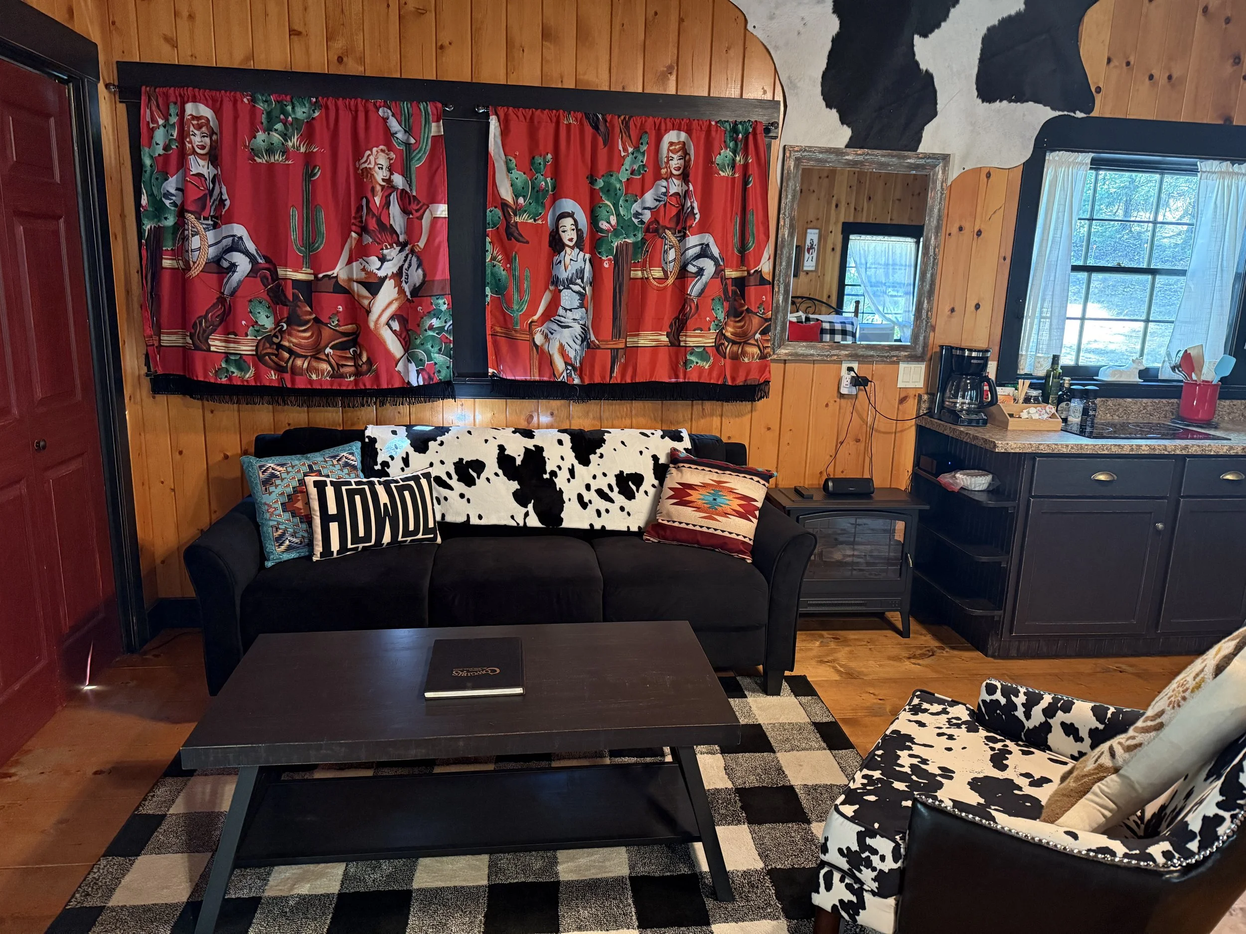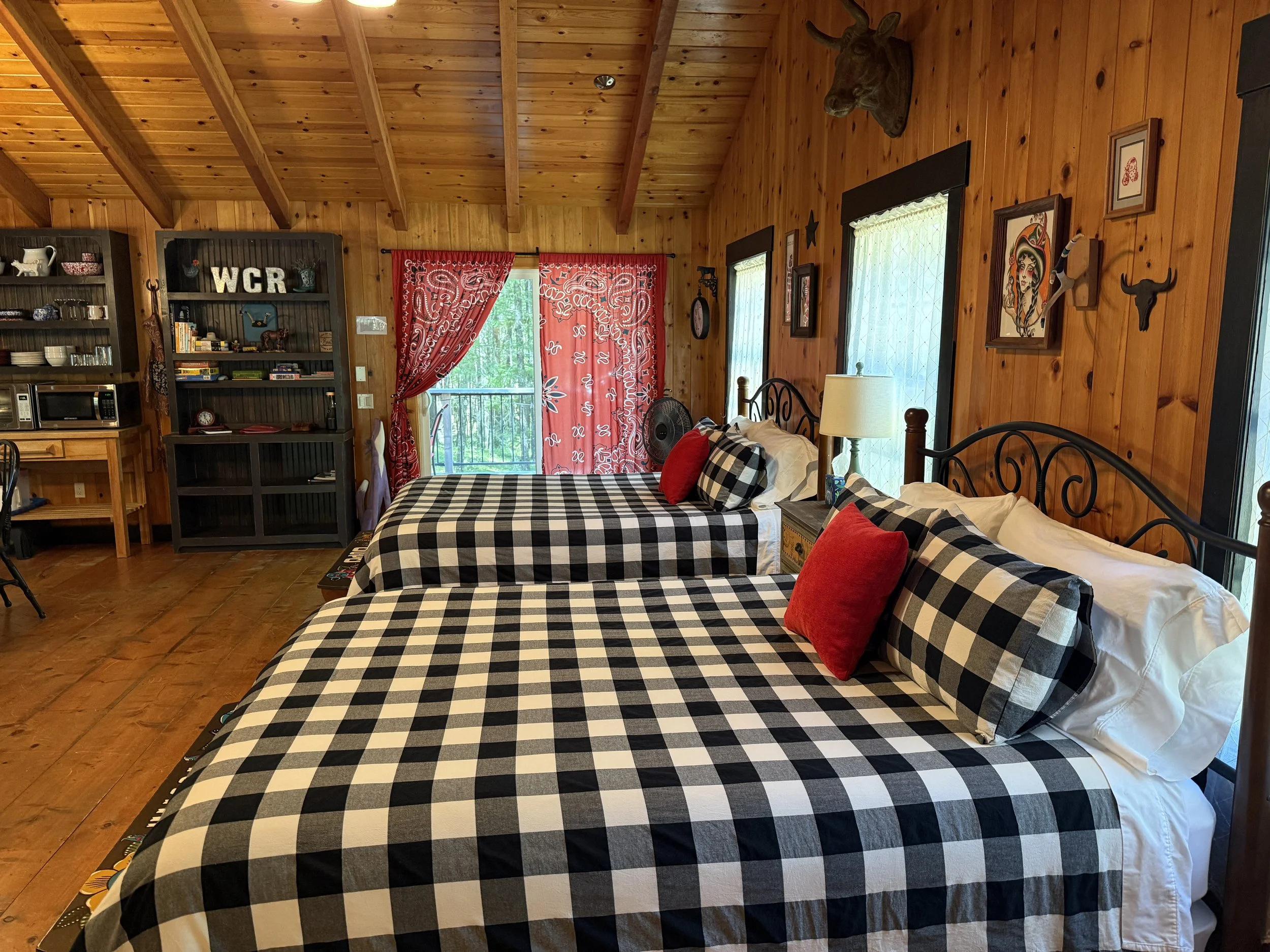 The Cowgirl Cabin is an open studio nestled in a clearing in a forested park-like setting on 70 acres. The kitchen is equipped with a full-size refrigerator, two-burner induction stove, convection oven, microwave oven, coffeemaker, toaster, and dining table. The couch corner has a couch, a comfy chair, and coffee table. There are two queen beds in the sleeping area. The bathroom has a toilet, sink, and shower. The cabin has a Bluetooth speaker, WiFi, bbq, a front porch and back deck.