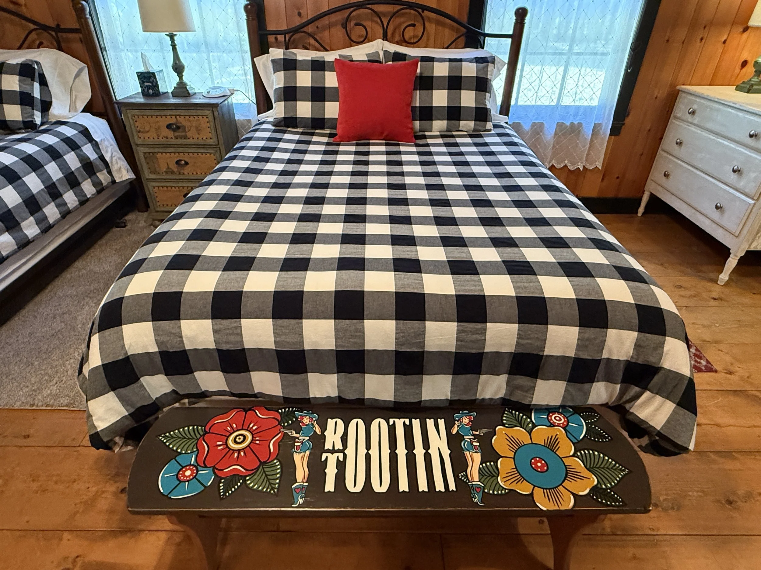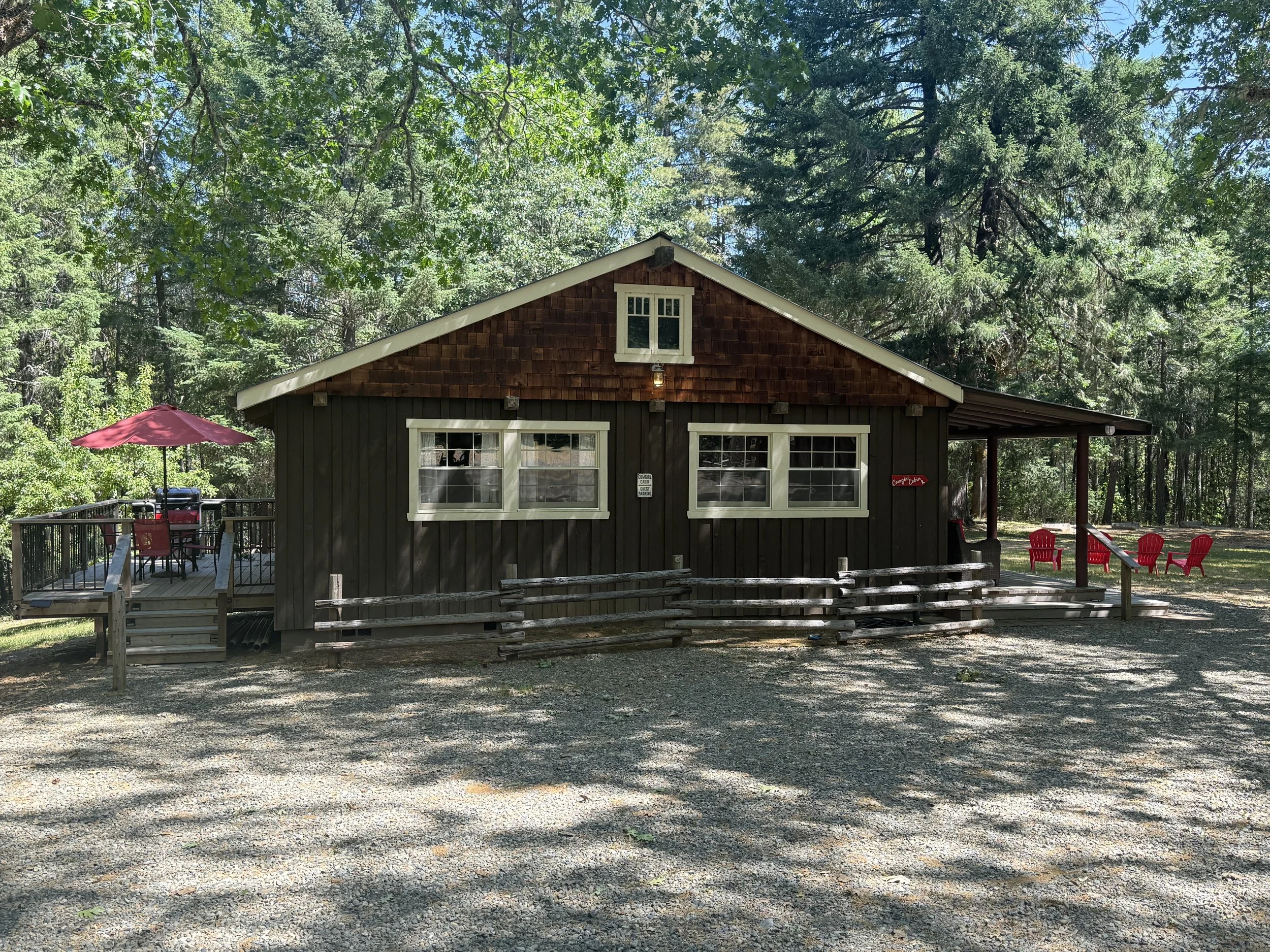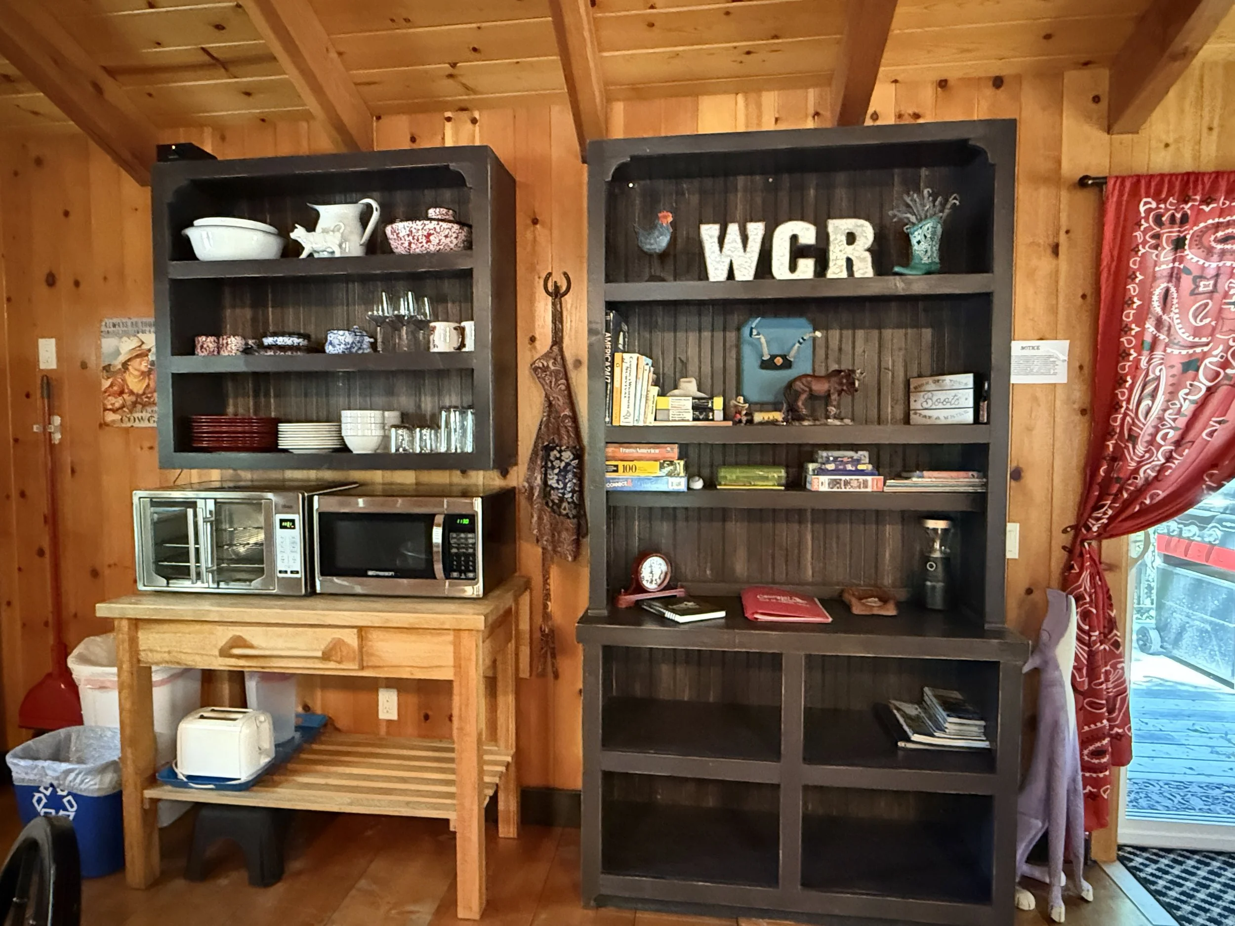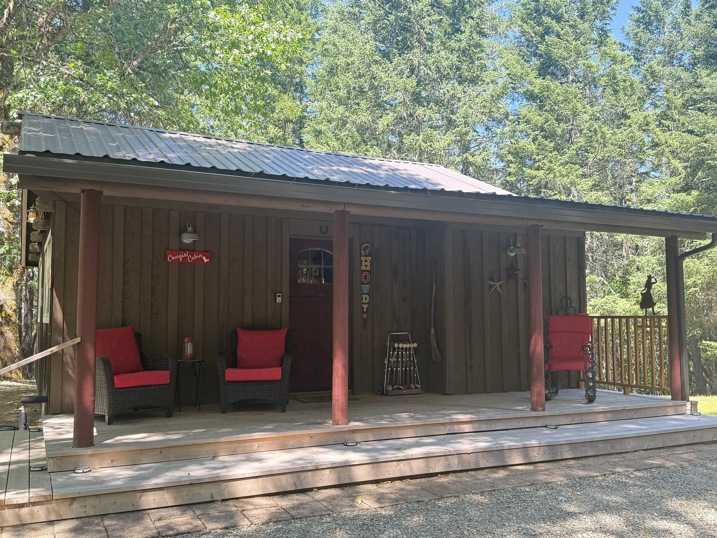The Cowgirl Cabin is an open studio nestled in a clearing in a forested park-like setting on 70 acres. The kitchen is equipped with a full-size refrigerator, two-burner induction stove, convection oven, microwave oven, coffeemaker, toaster, and dining table. The couch corner has a couch, a comfy chair, and coffee table. There are two queen beds in the sleeping area. The bathroom has a toilet, sink, and shower. The cabin has a Bluetooth speaker, WiFi, bbq, a front porch and back deck.